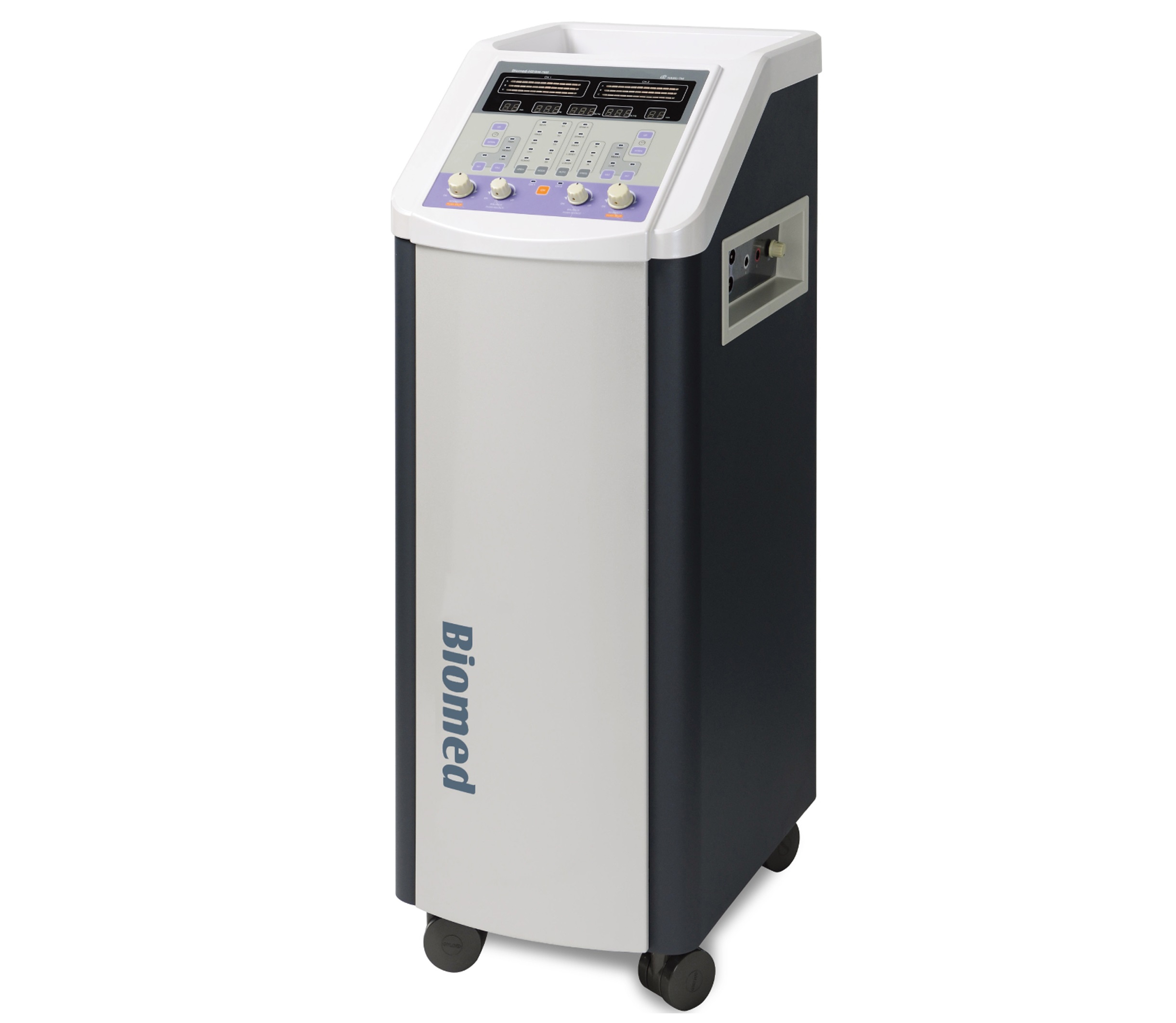 利用中频缓解肌肉疼痛,机器的左右各有输出通道,可以同时治疗两名患者。